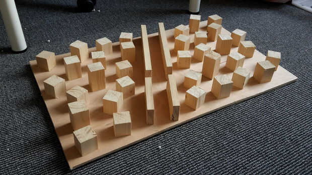 - Cortar piezas de madera a medida para usar como obstáculos. Los bloques que he utilizado son 32 x 32 mm de diámetro y 3 a 6 cm de alto.
