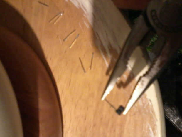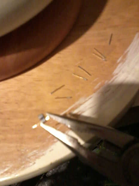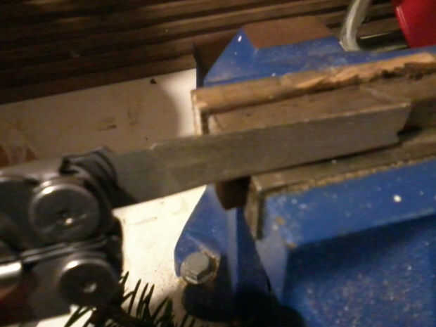 Usé un vicio y algo de madera para sujetar los pasadores en su lugar. Mi archivo era de una multiherramienta. He tenido algunos problemas con los pernos de ser afilados a un punto (más fina hacia la parte superior, pero todo en la parte inferior). Ajusté mi técnica para archivo con más presión en la parte inferior y salió recto.