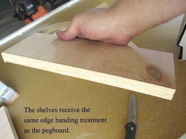 Si desea añadir alguna utilidad adicional a su tablero de clavija, puede construir estantes simples que se extienden a través de clavijas de dos o más. El estilo y las dimensiones de las estanterías dependerá en gran medida su estilo personal y usos previstos para el tablero de clavija de sistema de estantería. Para mis estanterías he optado por un diseño básico con algunos extra 3/4" madera contrachapada del abedul cortada en un ancho de 5". Me enfrenté a la parte frontal de los estantes con las bandas de borde tal como hice con los lados de la Junta de peg para ocultar las capas de la madera contrachapada.