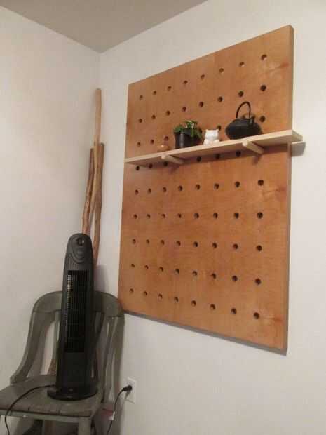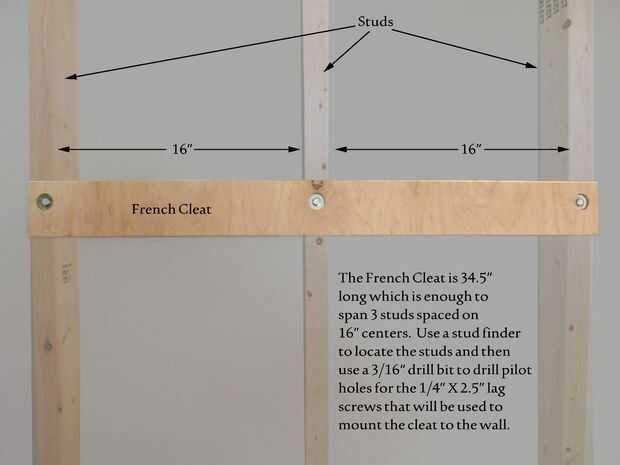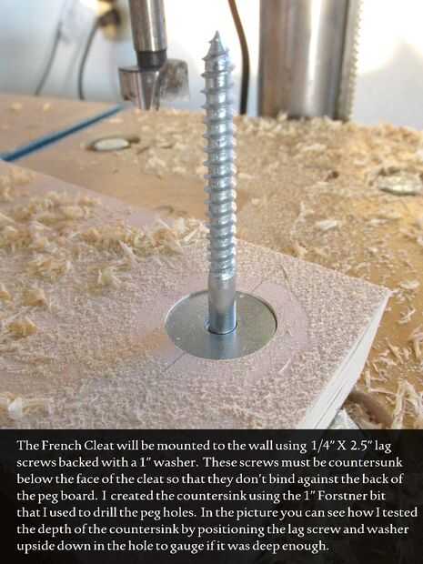 Recta final! Gracias a la utilización de la Cala francés sistema de montaje instalación del estante de la pared de peg board es un broche de presión. A la altura del piso aproximadamente 60" y luego use un nivel para marcar una línea recta horizontal. Ejecute un detector de vigas a lo largo de la línea y marque los dos o tres postes que funcionarán mejor para donde desea instalar el tablero de clavija. Utilizar una 3/16 broca para taladrar orificios en la pared para los gal 1/4 "X 2,5" que se utilizará para montar la Cala del francés. Ahora perfore agujeros en la cuña francesa que se alinean con los agujeros piloto taladrados en la pared primero perforar un hueco la Cala para que la cabeza del tornillo y arandela sentarse debajo de cara de la Cala, de lo contrario el lag que sobresalga la cabeza contra la parte trasera de la Junta de peg que evitará la Cala correctamente asientos. Atornille la abrazadera a la pared utilizando los 2.5" tirafondos, asegurándose de que la"Cala"es hacia arriba. Ahora todo lo que deben hacer es el estante encima de la Cala y luego lentamente baje hasta sientes la Cala en la parte posterior del tablero de clavija de registrarse en la tablilla montada en la pared.