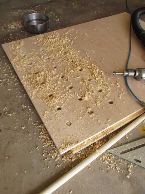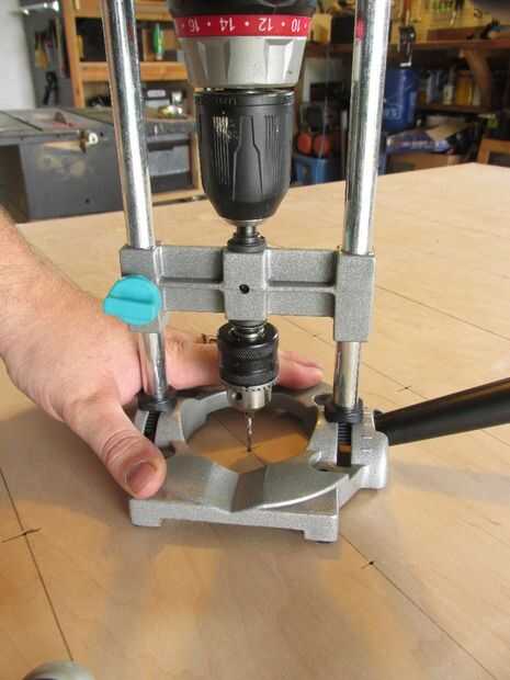 Antes de saltar derecho en el 1" agujeros para las clavijas de perforación, se deben perforar orificios pequeños para cada agujero grande que se perforarán. Estos agujeros deben perforarse con la guía de taladro para asegurar que sean lo más rectos posible. El propósito de los orificios piloto es mantener el estímulo del centro de su broca Forstner o espada alineada en la bores a través del bosque que ayudará a mantener los agujeros rectos. (orificios piloto de 72 + 72 1" agujeros = total 144 agujeros)