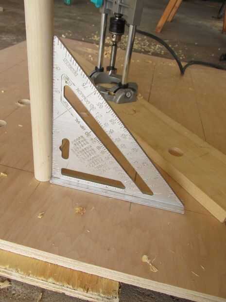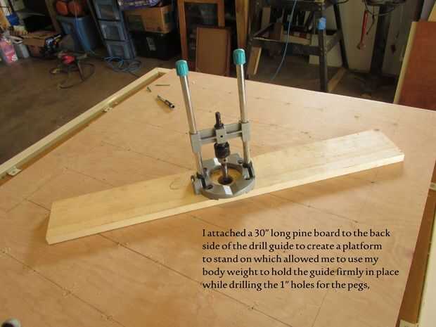 Que va a utilizar una broca Forstner o de horquilla de 1" para perforar los agujeros de peg y sugiero perforar unos práctica en madera primero para que usted puede probar el ajuste de la espiga 1". desea un ajuste que es apenas ceñido. Si las clavijas encaja a bien entonces luego serán imposibles de encajar en su lugar una vez acabado se aplica a los agujeros, y si están demasiado flojas entonces las clavijas look descuidadas y corren el riesgo de caída o caída.
