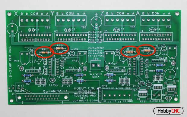 Inserte (4) resistencias de 100K (R9, R10, R11, R12 marrón negro amarillo oro). Recortar las puntas de