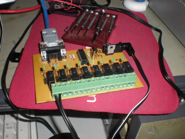 El proyecto es sobre un PCB con 8 relés que están controlados por un microcontrolador, que recibe órdenes desde un PC a través de interfaz de puerto serie.