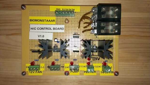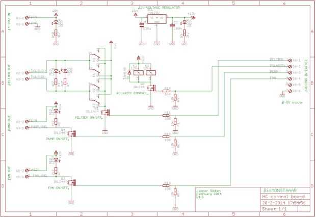 Esta tabla es la interfaz entre un Arduino en un lado, un peltier (para termoeléctrica de refrigeración/calefacción), un ventilador y una bomba de agua en el otro lado. Es parte de un lazo de control de temperatura en la que el Arduino mide la temperatura del agua y controles de calefacción o refrigeración del biorreactor BioMONSTAAAR . El peltier se enfría o calienta el agua. El ventilador sopla aire en el intercambiador de calor de peltier. La bomba transporta el agua alrededor del tanque biorreactor. MOSFETs gire a ON/OFF el poder de la peltier, el ventilador y la bomba. Relés se utilizan para invertir el poder del elemento peltier.