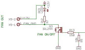 Un mosfet en el paquete TO-220 se usa para apagar el ventilador ON/OFF. El lado negativo, se conecta a tierra. Este MOSFET fue seleccionado debido a la baja resistencia de la drenar-fuente (28 mOhm en Vgs = 5.0V). El aumento de la temperatura calculada de lo mosfet es menos de 1 K, por lo que no necesita un disipador de calor. Un 10 k tire de resistencia se utiliza en el gate de lo mosfet para activar el mosfet apagado cuando la entrada se deja desconectada. Una resistencia de 150 Ohm en serie con la puerta limita la corriente al Arduino es cargar la capacitancia de compuerta de lo mosfet. El ventilador tiene dos conexiones terminal de tornillo en el tablero de control: + 12V y FAN_GND. Los cables amarillo y azul del ventilador están conectados a + 12V y el cable negro está conectado al FAN_GND.