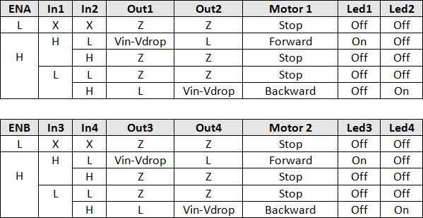 Nota: Hay una caída de tensión entre el voltaje de entrada y salidas de motor del L298, usted puede esperar un 1V a 3V gota dependen del voltaje de entrada y corriente.
