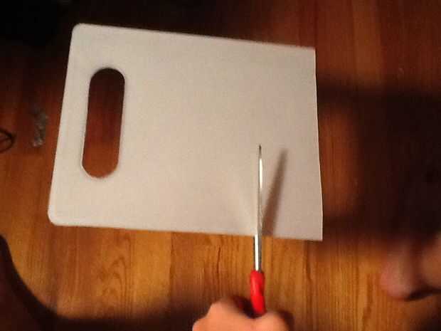 Aquí es donde usted puede conseguir creativo, corte una tira de cuatro pulgadas de la tabla de cortar, luego cortarla por la mitad, de aquí se puede utilizar cualquier diseño que desee, sólo asegúrese de que tiene una ranura para el disco, similar a un cortador de cinturón de seguridad. Ahora, traza el diseño sobre el otro trozo de tablero de corte y corte, la hoja irá entre estos.