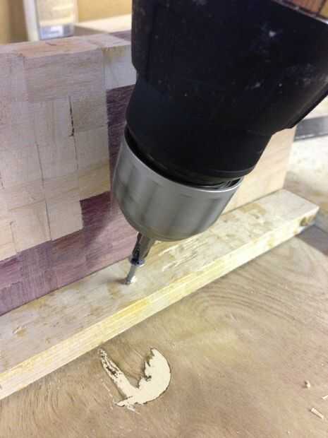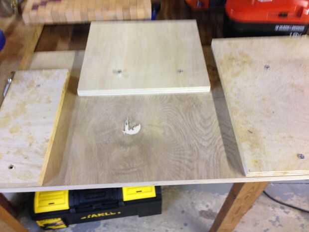 La lijadora puede lanzar la madera que no está sujeta a, y no se puede lijar la zona que se ha afianzado con abrazadera. Así que hice una 'plantilla' que sostendrían los tableros mientras que arena les. Nada de lujo, a cuatro cuadras de madera contrachapada, perforado en el lugar.