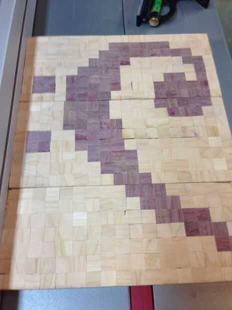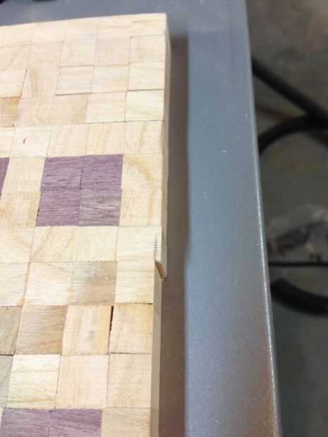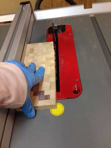 Tenía un bloque de madera - no estoy seguro qué especies - unos 12 x 3,5 x 2" y me di cuenta que podía hacer algunos tableros de corte práctico tamaño personal de él.Comencé a usar mi ingletadora pero notados (dos cortes en el proyecto) que cada cort
