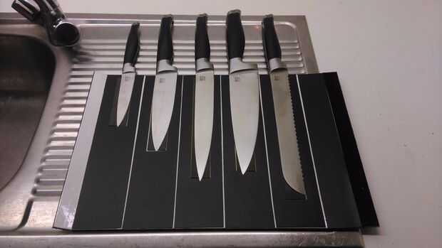 para mi nueva asignación que tuvimos que hacer un producto innovador flatpack. Decidí desarrollar un nuevo concepto a utilizar en la cocina. Portacuchillas son grandes y pesadas piezas de madera que tienen un montón de espacio en su fregadero de cocina. Me enseñó acerca de un concepto que es ligero, práctico y tiene dos funciones: un sostenedor del cuchillo y una tabla de cortar todo en uno.