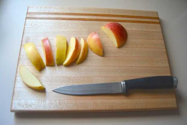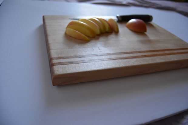 Tenía un bloque de madera - no estoy seguro qué especies - unos 12 x 3,5 x 2" y me di cuenta que podía hacer algunos tableros de corte práctico tamaño personal de él.Comencé a usar mi ingletadora pero notados (dos cortes en el proyecto) que cada cort