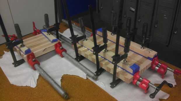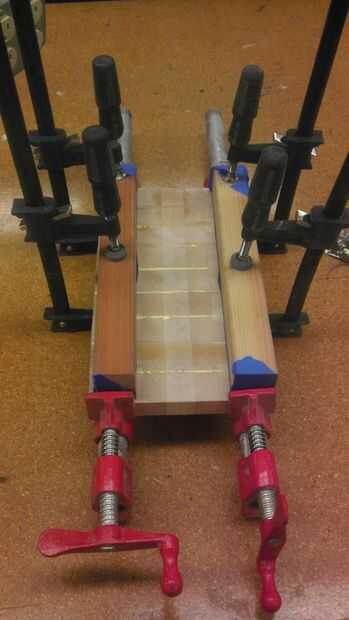 Nota: Aquí es donde me topé con problemas. Debido a mi error de Sierra de mesa, tuve pequeñas en mis piezas. Para corregir esto, decidí solo se aplica toneladas de fuerza de sujeción. Esto funcionó, pero también saludó mi Consejo ya que no había aplicado las abrazaderas verticales aún. Por desgracia, no noté esto hasta que la Junta había tratado. Fue leve, pero cuando coloqué mi Junta secado sobre una superficie plana (como el área de trabajo de Sierra de mesa), había una mecedora distintas de la Junta. Era capaz de corregir para la mayoría de esto mediante el uso de los planos, pero es un dolor de cabeza bastante grande. Por lo tanto, asegúrese de aplicar sus abrazaderas verticales temprano en el proceso de fijación.
