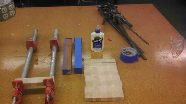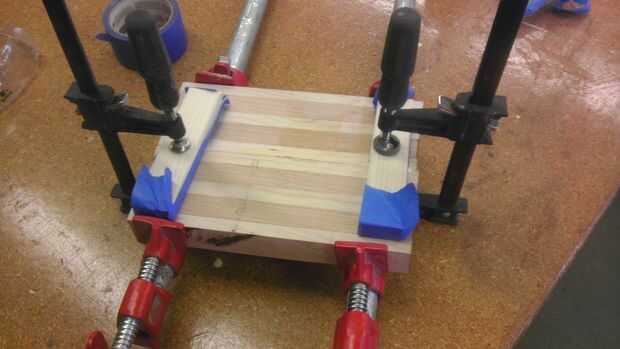 2. preparar dos pedazos de desecho de la madera para actuar como almacenador intermediario para sus abrazaderas verticales. Deben tener o enmascarar o cinta sobre ellos para evitar que el pegamento se adhiera a la placa aislante.