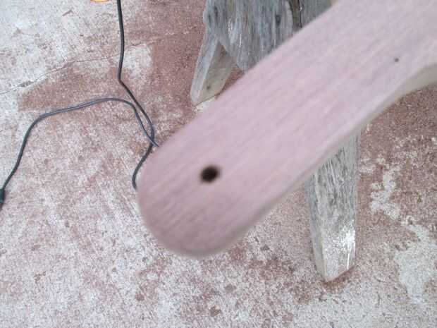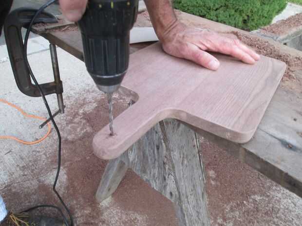 Para colgar la tabla de picar, perforé un agujero de 5/16 de la manija. Perforar un agujero más pequeño primero y luego lo perforó a tamaño final. Después de taladrar el agujero, usé un avellanado para hacer un acabado cónico.