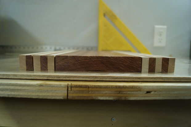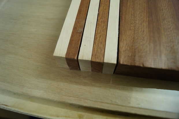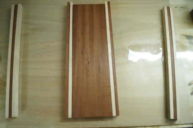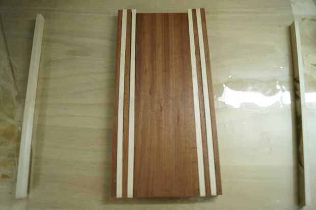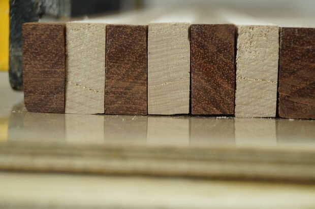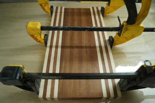 Corte las tiras es bastante sencillo. Llegar a las dimensiones de la Junta y averiguar cuántas tiras se quieren y la disposición de la Junta. Una vez que ha cortado las tiras, les pone hasta para visualizar el tablero y finalizar el patrón, lo que entonces no es abrazadera para comprobar las diferencias y averiguar donde pueden doble ni tuerza las tiras. Este paso es importante porque muestra donde más tensión se requiere y los mejores lugares de colocación de la abrazadera.