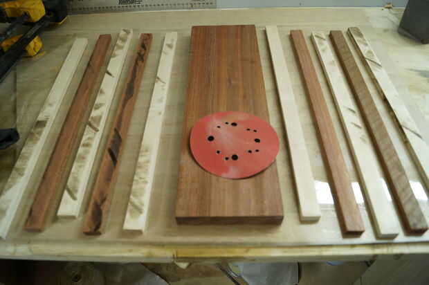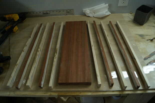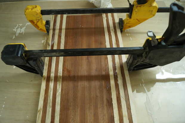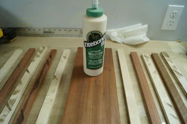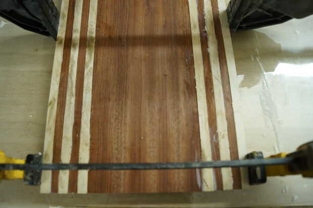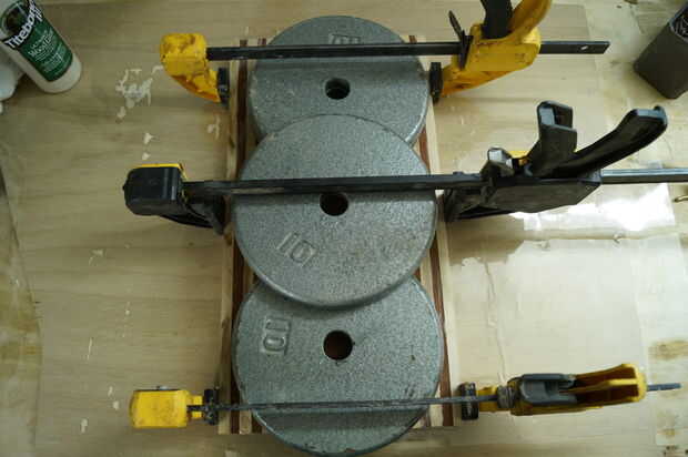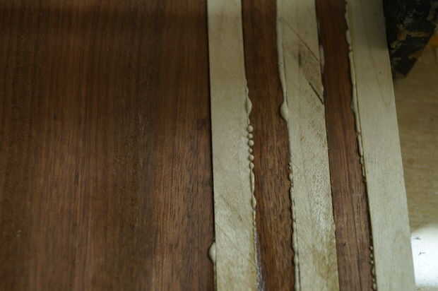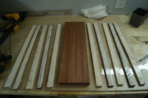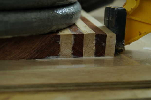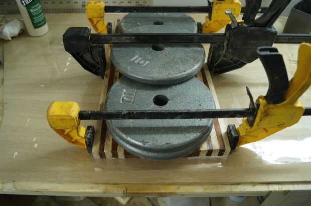 Este paso es donde tiempo gestión convertido en crucial, madera pegamento se configura rápidamente, por lo que es importante no para aplicarle. En cuanto a la cola, prefiero Titebond 3 por su resistencia y cualidades resistentes al aguas. Mi primer todo laico de mis formas de tiras de lado y aplique una buena. Entonces uso mis dedos para distribuir el pegamento en las tiras. La cantidad de pegamento puede ser complicada, por muy poco puede causar una unión débil y demasiado puede ser un dolor para limpiar para arriba / de la arena. Me parece que aplicar suficiente pegamento para cubrir completamente la superficie en una capa bastante gruesa de la cola, sin embargo, un poco va un largo camino, así que puede ser útil para aplicar, alisar entonces determinar si ya es necesario. Después de aplica el pegamento, cuadrado por los bordes de un cuadrado de la velocidad o alguna otra pieza de 90 grados y aplique las abrazaderas rápidamente. Mientras es sujetada la tarjeta Asegúrese de que no levante los lados y que todas las tiras estén todavía nivel al ras con los demás. Finalmente, poner su peso en el tablero y dejarlo seco (dejo la cola toda la noche).