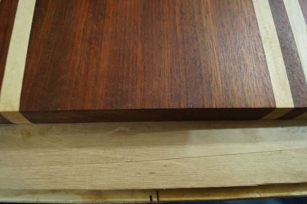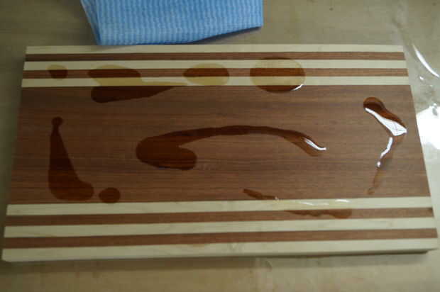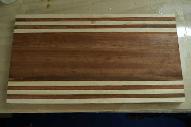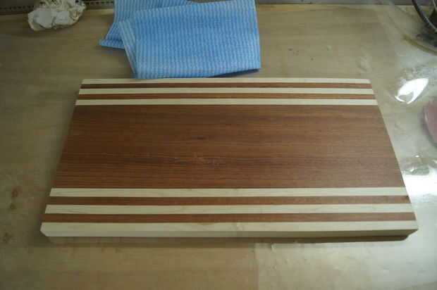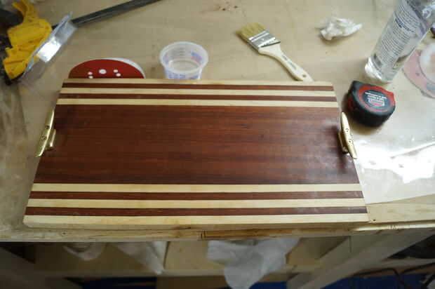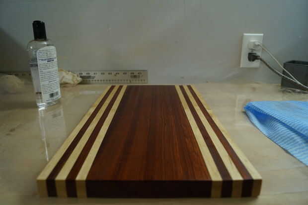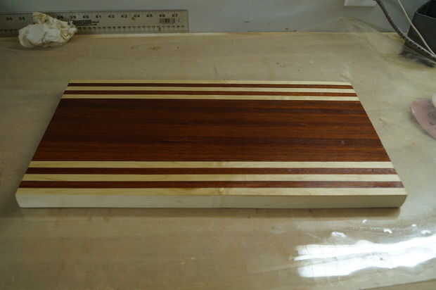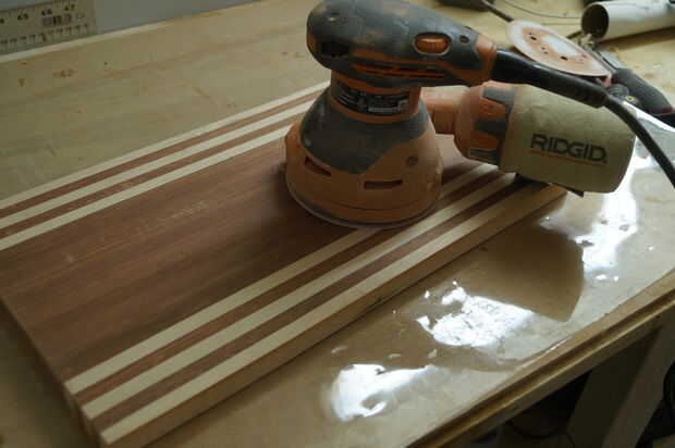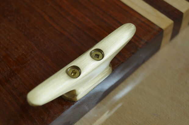Esta es la parte más gratificante del proyecto. Después se seca el pegamento en las grietas, cuadrado encima de cualquiera de los extremos con mi sierra, sin embargo, esto puede lograrse con cualquier Sierra. Luego utilizo 60 papel de grano arena a arena a cualquier imperfección, después de que se hace trabajar mi camino hasta la 220 con la lijadora, luego cambiar a lijado a mano con 320. Una vez realizado el lijado, preparar la superficie para bañarlas con aceite. Para ello, utilice un, paño o incluso toallas de papel para quitar cualquier polvo del tablero de corte de aceite. Puede ser útil usar un paño húmedo para recoger el polvo. Una vez que se prepara la superficie, frote en varias capas de aceite mineral e instale cualquier opcionales. Algunas personas les gusta instalar manijas etc., pero el cliente quería tacos de latón pequeño como este foro está destinado para su barco. Me parece que especialmente con latón atornillada puede ser más sencillo utilizar epoxi parte dos para instalar las abrazaderas con tornillos en epoxy. Una vez seco el epoxi, barnizadas las calas con 220 en aceite para una mirada más utilizada / menos apariencia brillante de mecanizado.