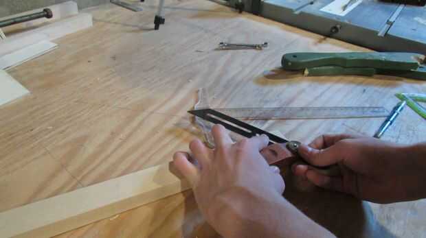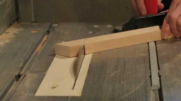 Después de mucho ensayo y error he encontrado las medidas para hacer los trapecios encajan muy bien en paquetes grandes. La pequeña parte superior del trapezoide tiene que ser la misma longitud que los lados inclinados. Marcado unos trozos con guía cartabón y mi calibre de ingletes en la mesa de Sierra de 60 grados, después de que vieron unos cortes que subió con un método más rápido de creación de un bloque de tope en la mitre y hacer cortes de 30 grados. Esto resultó para ser mucho más rápido y repetible, así que me fui en modo conjunto. Hice un montón de piezas extras en caso de que cometí un error, que resultó que terminó hace mucho.