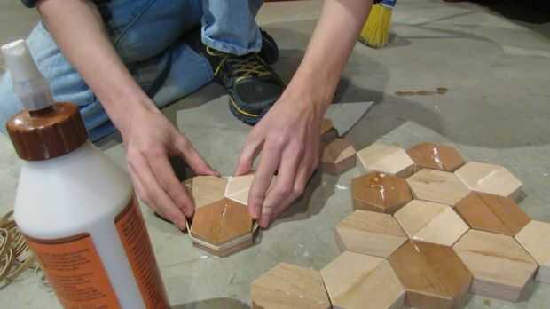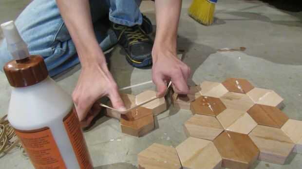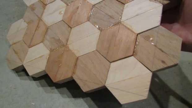 El siguiente paso de pegado es poner los hexágonos en grupos de tres. Otra vez usé gomas, pero es un poco más difícil poner alrededor de los pedazos. El pegamento que utilizo es gorila pegamento de carpintero, que es un pegamento muy fuerte y es resistente a la humedad.