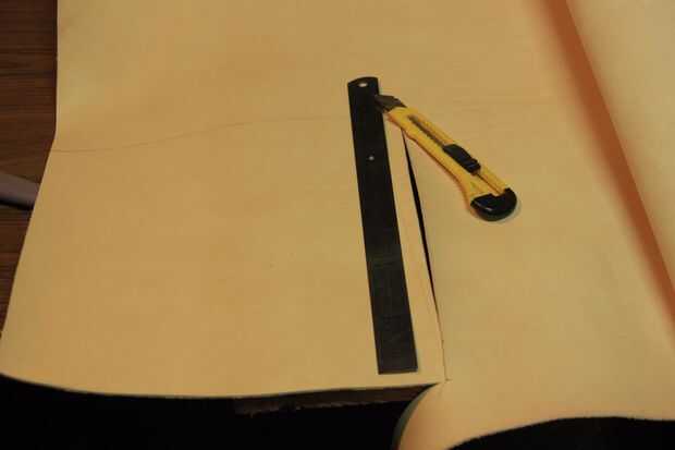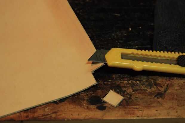 Después de que hayas cortado tu piel, necesita medir la profundidad de la placa base de madera y luego cortar un cuadrado de esa medida en cada esquina de la piel-ver segunda foto.