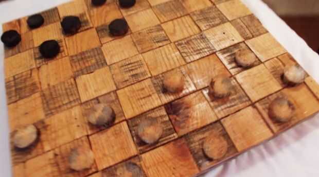 esto es un ajedrez/damas Junta que hice fue cortar con una motosierra de un tocón de árbol álamo amarillo que tenemos de la propiedad. Utiliza una lijadora de banda con lija de grano 60 y 80 para abajo los bordes ásperos de los cortes de motosierra y