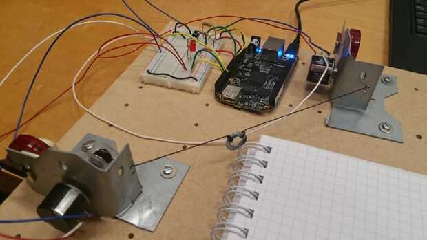 La forma de mapa x y y coordenadas es mediante dos potenciómetros lineales: uno para x y otro para y. Estos cambian voltajes cuando tira. Esta configuración debe montarse sobre una superficie que hace que sea fácil para el usuario dibujar usando un utensilio de escritura normal (consulte la imagen de la lista de materiales). La superficie que hemos elegido es una pieza plana, lisa de madera que podemos instalar los soportes a. Hemos perforado uniformemente los agujeros espaciados a lo largo de las fronteras para colocar los soportes en así que asegúrese de que el espacio coincide con los soportes. Los soportes debían colocarse diagonalmente enfrente de la otra (ver imagen) por lo que uno podría medir x los valores y el otro y. La forma en que estos valores se miden es la tracción y retracción de una cadena de resorte que viene en este caso de dos titulares de la tarjeta. Esto es entonces lugar en los soportes para que las cuerdas se pueden extender hacia afuera. El siguiente paso es colocar dos bobinas en el extremo de los potenciómetros. Esto es lo que girará el potenciómetro una vez que se tiran las cuerdas como se envuelven alrededor de las bobinas. Por último, estas cadenas se unen a una arandela en el centro por lo que se puede colocar un lápiz en la lavadora y el usuario puede empezar a dibujar como lo hacen normalmente. Con todo esto en su lugar, el aparato está configurado.