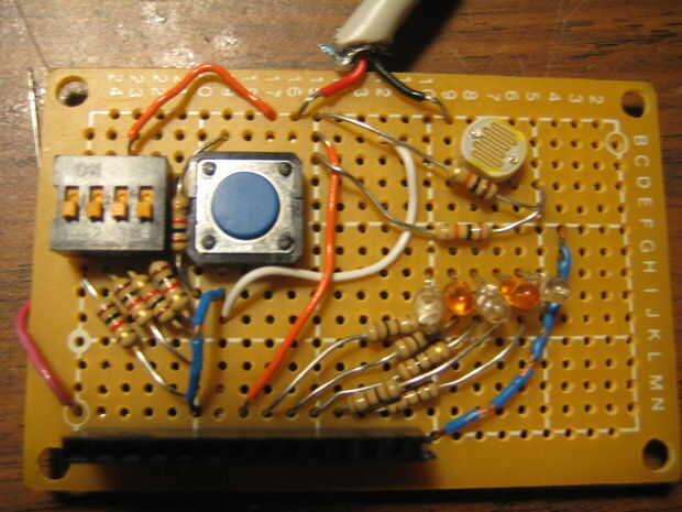 La soldadura en el foto resistor.  Conecte un lado a tierra. Conecte la otra a 5v a través de 2 paralelo 10 k ohm resistencias.  Conecte el lugar entre ellos en la cabecera de la mujer.  Esto permitirá que cualquier microcontrolador detectar el nivel de luz.