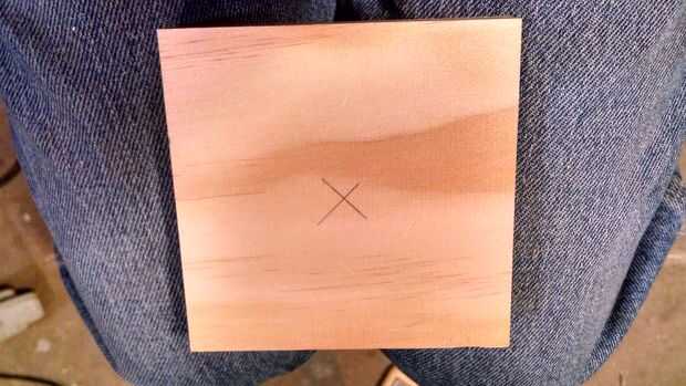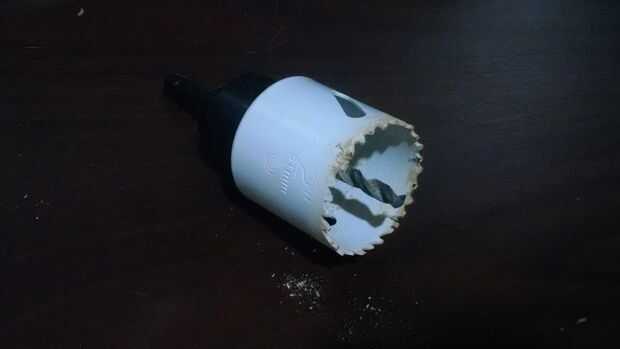Entonces tienes que marcar el centro del bloque en ambos lados con un borde recto y alineando las esquinas. Esta marca es que se perfore con el serrucho. Antes de taladrar en la parte trasera toma la tuerca del adaptador trampa, línea de la marca en el centro de la tuerca y trace una línea alrededor del exterior de la tuerca. Luego usé una sierra del agujero 2", 1-7/8" es lo que habría sido un ajuste más apretado mejor para las roscas del adaptador trampa pero no tiene uno, así que fue al tamaño más grande.