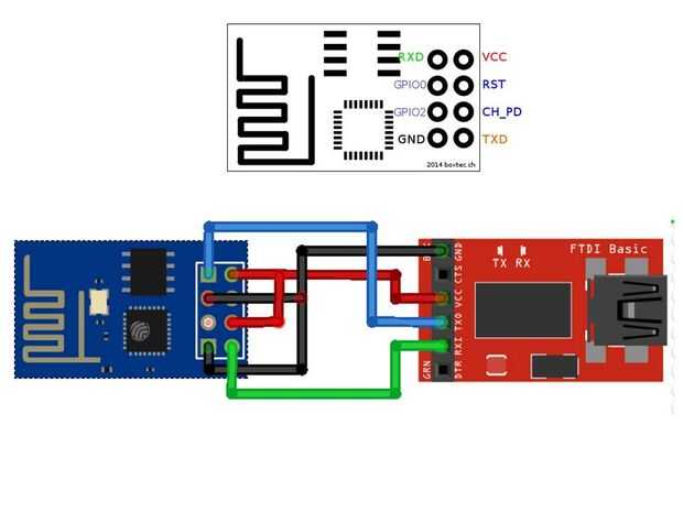 En primer lugar organizar su esp y FTDI (USB-UART) y conéctelos como se muestra la figura (Nota: 3c3 externos es mejor para tu esp8266 en lugar de utilizar el 3c3 del chip FTDI)