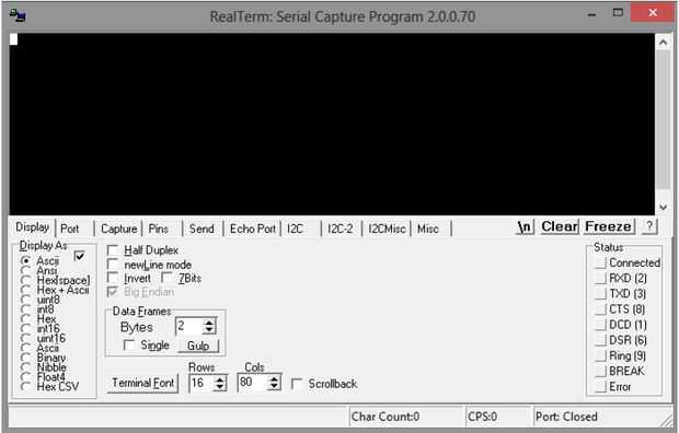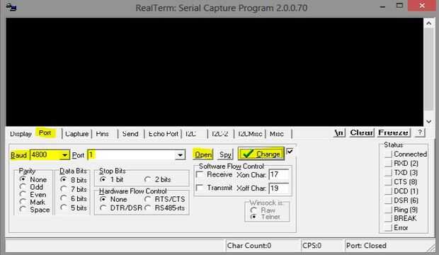 Primero establecer la velocidad en baudios en el terminal serial a 9600 y luego el número de puerto del módulo UART USB que se puede llegar desde administrador de dispositivos en windows luego oprima cambiar y luego pulse Abrir. Se puede ver figura para más detalles.