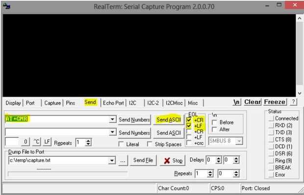 Tenga en cuenta + CR + LF debe seleccionarse si todo está bien que debe obtener el firmware detalles de versión en la ventana negra.