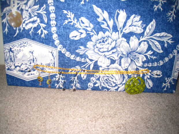 Para colgar mi dangly pendientes, ensartadas en un collar mardi gras entre 2 pines en la parte inferior de la Junta. El espacio entre los granos hace que los pendientes alojarse perfectamente en pares.