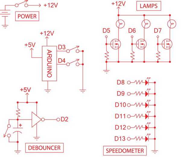 Velocímetro: Seis LEDs se unen por medio de resistencias de limitación actuales directamente a los pines de salida digital del Arduino.