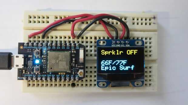 El tablero de mensajes utiliza un fotón partícula (Arduino compatible) para el cerebro y conectividad a internet y un OLED monocromática de 128 x 64 pantalla.