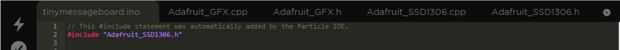 Porque el código de la biblioteca necesita modificaciones, decidí incluir los archivos en el proyecto directamente en lugar de "incluir" desde la web de IDE. Para añadir una biblioteca, haga clic en el pequeño + icono en la parte superior derecha de la IDE de construir y el tipo en el nombre (ADAFRUIT_GFX o ADAFRUIT_SSD1306). Esto creará un par de archivos (.cpp y .h) donde puede pegar cada archivo. Usted debe terminar con total de 5 archivos, la aplicación .ino y los archivos de 4 biblioteca. La cuenta de modificaciones por el hecho de que algunas bibliotecas y funciones ya están definidas para el fotón y también para cambiar la dirección I2C base de la pantalla (hemos utilizado 0x3C requerido para esta indicación).