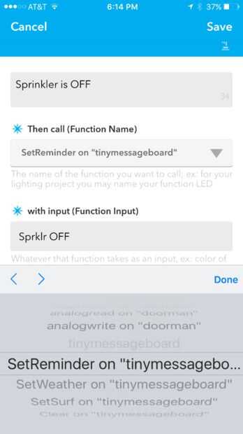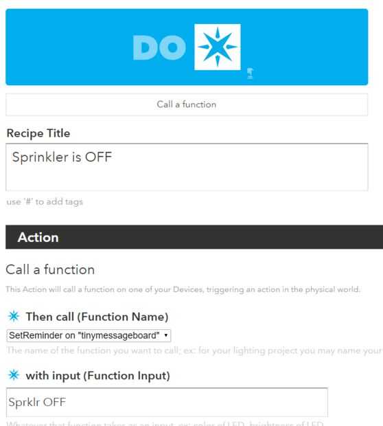 Primero vamos a crear una forma de configurar nuestro recordatorio de nuestro teléfono usando un IFTTT "hacer" botón. En este caso, el aviso es que el sistema de riego es apagado (demora por lluvia). Descargar la aplicación IFTTT de «Hacer» en el teléfono y vamos a crear un botón para representar nuestro primer "mensaje". Puede crear la receta en el teléfono o el sitio web IFTTT utilizando el "DO" ficha permite llamada "Regadera apagado" o cualquiera que sea su recordatorio debe ser. Para el canal, seleccione el canal de partículas y permite "llamar a una función" en nuestro dispositivo. Encontrar la función en su fotón llamado SetReminder y establezca el parámetro de la función de ser el recordatorio; en este caso "Sprklr OFF" (sólo tiene 10 caracteres, a menos que ir a un tamaño de fuente más pequeño). Ahora tienes un botón que será el recordatorio remotamente su fotón. Para borrar el recordatorio, crear un segundo botón de hacer llamar la misma función, pero esta vez paso en un parámetro vacío.