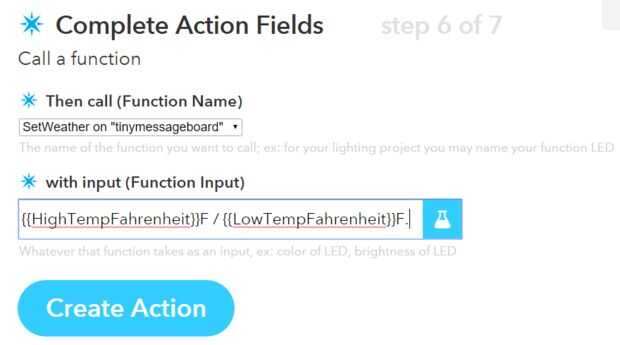 Crear una receta nueva y seleccionar el canal "el tiempo". En el gatillo de crear, seleccione "Informe del tiempo de hoy" y 6:00 para el momento de la actualización. Para la parte de "Esa", le llamaremos la función SetWeather en nuestro dispositivo. Seleccione "SetWeather" en su "nombre de dispositivo del fotón". Editar la información para mostrar la temperatura baja y alta como se muestra (los "ingredientes" de tu receta).