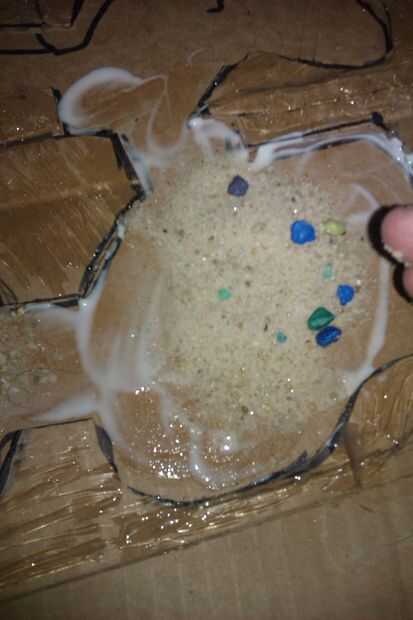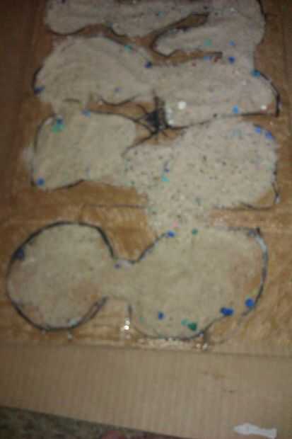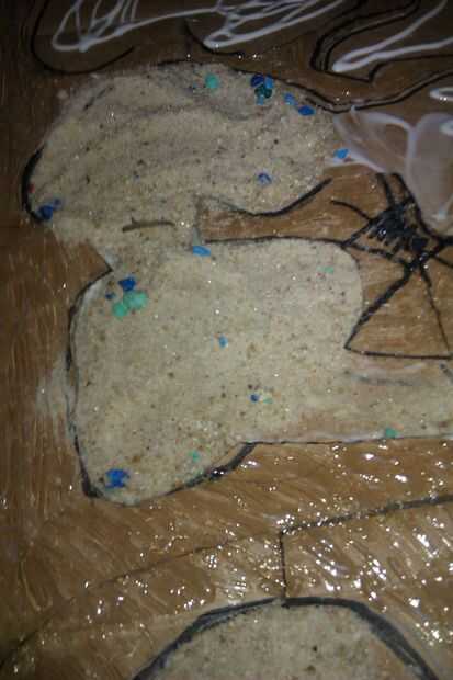 Como dos habitaciones a la vez para que el pegamento no se seque en ti. Hacer un pequeño charco de pegamento blanco en la habitación. Difundirlo alrededor con el dedo y verter un poco de arena hacia abajo en él. Puede presionar ligeramente hacia abajo en la arena.