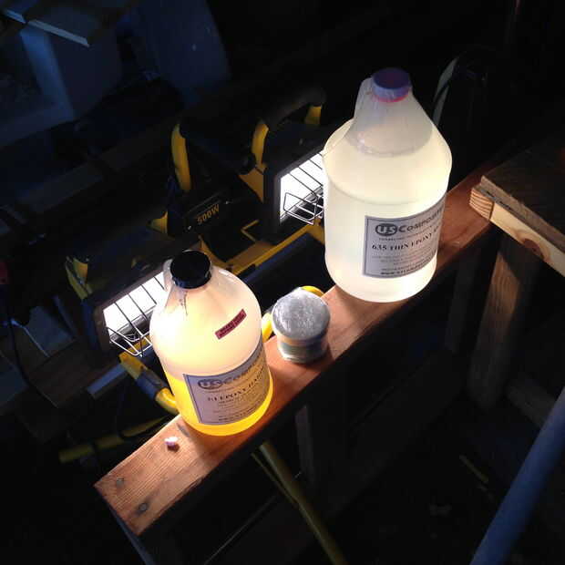 Que he enumerado en este proceso en varios pasos a la gente de guía a lo largo pero estoy muy lejos de ser decente cerca en este proceso. Esta es la primera vez que he alguna vez fiberglassed y sinceramente me gustaría mucho ver de personas prefieren escuchan unos videos de YouTube y leer un libro en canoa edificio que nada que tengo que decir. Antes de empezar, configure el epoxy y el endurecedor con las bombas y situado frente a un calor o lámpara. Esto calienta el líquido y hace que sea menos viscoso y más fácil trabajar con.
