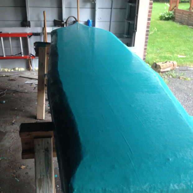7) una vez cada lado ha sido cubierto con dos capas de base iniciales los izquierda a secar durante un par de días, uno puede comenzar a usar capas más de epoxi para suavizar el casco y la cubierta del barco. Usando una 'una vez' pintura Pincel funciona bien para este proceso. Creo que el método de la lámpara de calor es más importante escuchar como la más fina resina tiende a dejar menos imperfecciones.