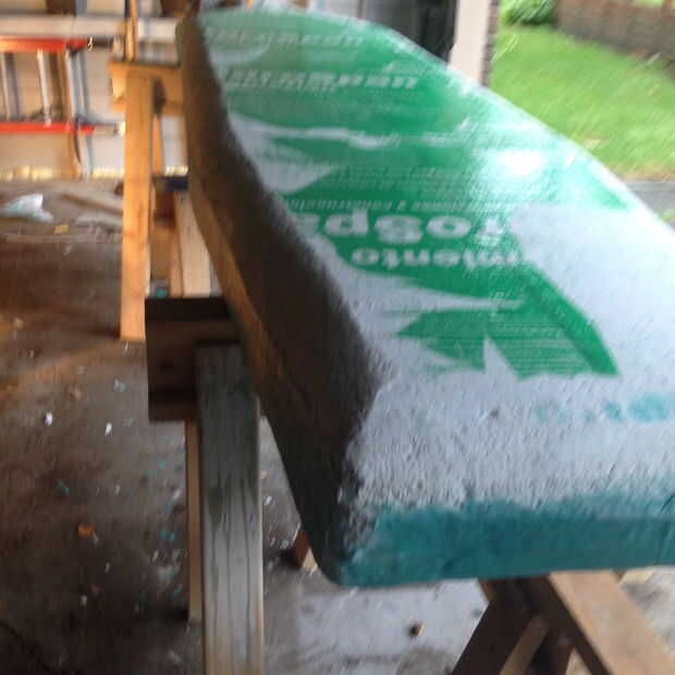 1) empecé con la parte superior por lo que pude practicar técnica en el lado no funcional de la Junta. Comenzar colocando la fibra de vidrio a lo largo de la longitud de la Junta y centro de lo mejor que puede. Usando una brocha, cepillo hacia fuera de los lugares donde levanta el cuerpo de espuma. Ahora, mi junta fue cerca de 31" de ancho y fue la fibra de vidrio 38" de ancho pero no lo corté a la medida. Quería ser capaz de envolver alrededor de los bordes un poco y dejar algún exceso para recoger goteos.