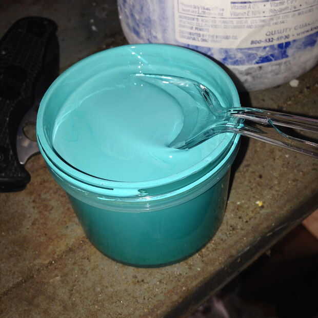 2) una vez que la fibra de vidrio en su lugar pasar a la fase de epoxy. Mezclar la proporción correcta de resina y endurecedor y mezcla bien, también puede Agregar en este punto aproximadamente media cucharadita de pigmento (que he encontrado, pigmento un poco va un largo camino y no importa si agrega la cantidad exacta precisamente con cada mezcla). Siguiente Vierta el epoxi a lo largo de ellos el centro del tablero y propagación hacia atrás y adelante, arriba y abajo, lado a lado con el raspador de pintura plástica hasta que se satura completamente la zona. Una vez hecho esto, mover a la siguiente área y agregar más. Los lados eran un poco difíciles con el raspador de pintura por lo que sólo lo untó en con un guante de goma. Una vez que has cubierto toda la pieza de fibra de vidrio, esperar aproximadamente 2 horas.