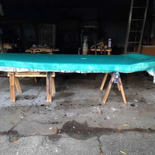 4) después de todo, se ha endurecido durante unos días, recortar el exceso fibra de vidrio que se ha endurecido y palos desde el formulario de manera catty-whompus. Recorte con tijeras no puede obtener cada fibra por lo que después de esto tomé una lijadora orbital para suavizar los bordes hacia abajo. Una vez que los bordes son lisos que puede voltear el tablero y fibra de vidrio del lado opuesto.