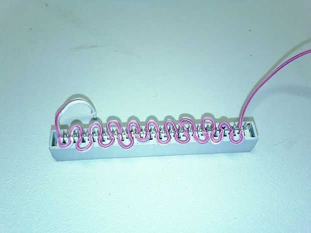 Usar la cinta de alambre encima de los rieles que se enlazan a los primeros alfileres juntos, el todos los pernos de la parte inferior. Utilice el destornillador para empujar el alambre en su lugar antes de usar el vicio otra vez la trampa de los cables