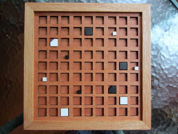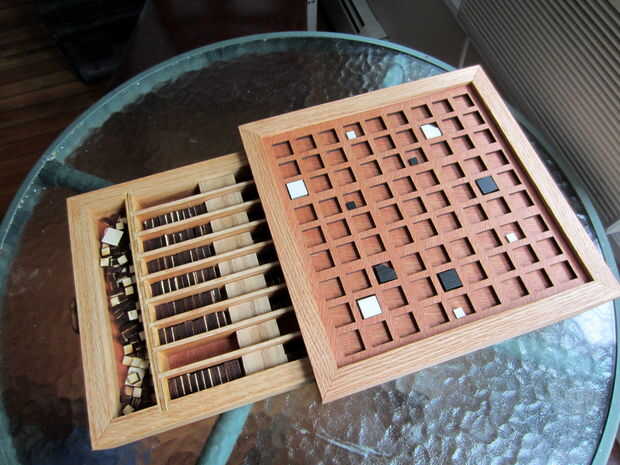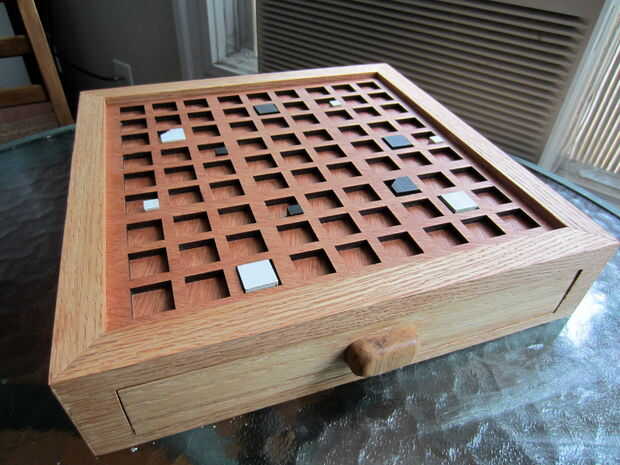 Puedes ver las piezas dispuestas en los cajones. Corté unos trozos de madera dura para usar como separadores dentro de la ranura de cada cajón, para que las piezas 'dado' y 'adivinar' pueden ser consideradas apartes. Sólo flotan libremente en el cajón y puede ser quitado para facilitar el acceso.