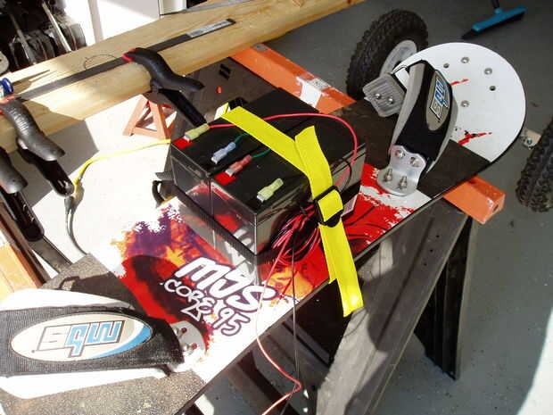 Dos baterías de moto de 12V conectadas en serie para proveer 24V para el controlador y montadas en el centro del tablero con pequeños tirantes. Este archivo PDF es muy útil y muestra cómo conectar las baterías: Diagramas de cableado de la batería