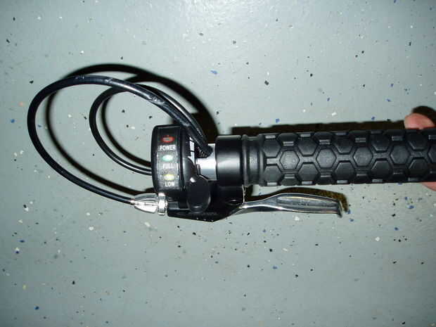 La válvula reguladora del pulgar fue colocado en el extremo de la manija del freno después de quitar un tapón de goma. Los cables del acelerador se alimentaron luego hacia abajo a través del mango y manga siguiendo el cable del freno.