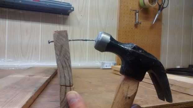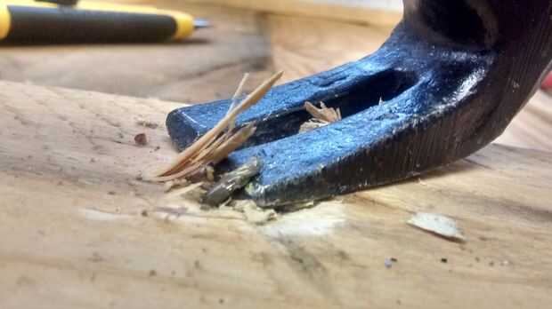 Al principio empecé a desmontar los palets con un martillo y una palanca. Esto funciona - lo he hecho antes, pero porque estaba preocupado por salvar mi buena madera y no tener cualquier pieza rota o perdida (que pasa), no estaba satisfecho con este método. Como se puede ver en la primera foto, las puntas de la uñas de las uñas estaban decididas hacia la madera bastante profunda, así que tuve que cavar hacia fuera.