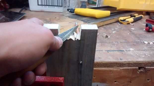 Utiliza una sierra de mano para hacer una serie de cortes para el agujero del centro y luego utiliza mi cuchillo para alisar hacia fuera de la muesca (fotos 2 y 3).